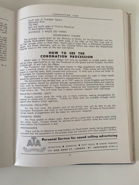 As a special coronation edition, the publication also provides details for the celebrations including the procession route and the list of official events, which ran from 27 May (commencing with a lunch at Westminster Hall) until 25 July (culminating with the Queen’s presence at the Civil Service Sports Day in Chiswick). It also explains how you could view the coronation procession, including via television (many UK families bought their first tv set for the occasion).