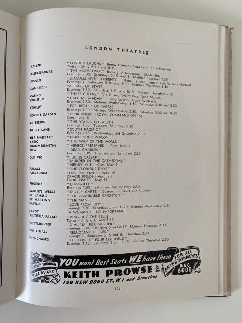 The theatre guide is absolutely fascinating; new play The Mousetrap (which famously become London’s longest running production) was on at the Ambassadors Theatre with a cast featuring Richard Attenborough, Sadler’s Wells had a Gilbert and Sullivan season, and London Laughs was at the Adelphi, starring Tony Hancock and Vera Lynn.
