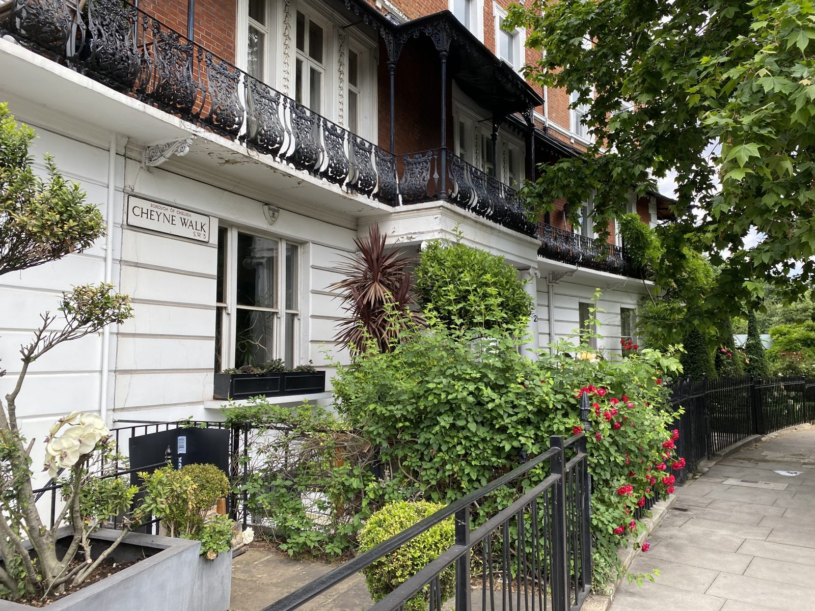 Cheyne Walk is even more breath-taking than when it was first built, with well-established wisteria, roses, seasonal perennials and topiary buxus adorning the facades and front gardens.